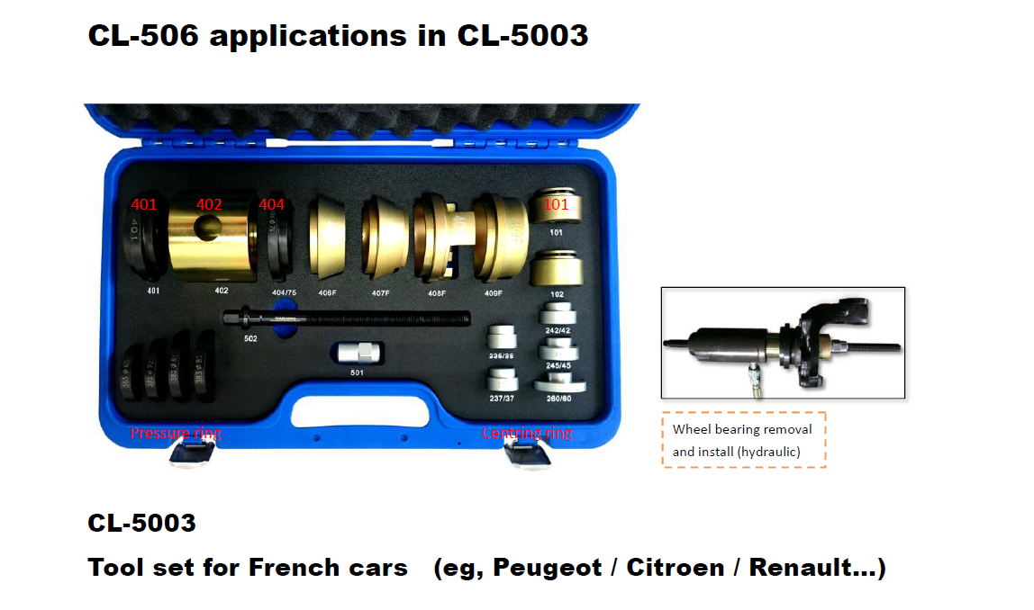 - Two specially designed adapter(101,506-4), accurate and safe guidance of the hydraulic cylinder and the clamping nut fixed on the wheel hub bearing tool set the center.