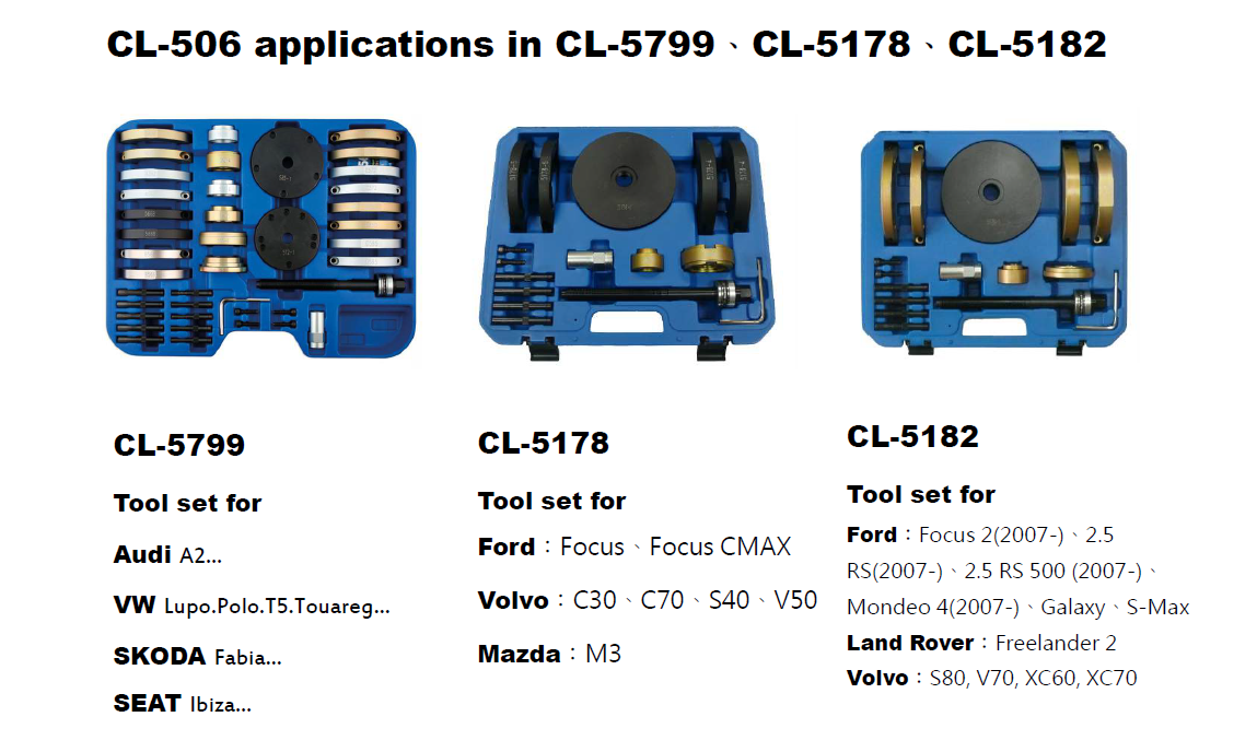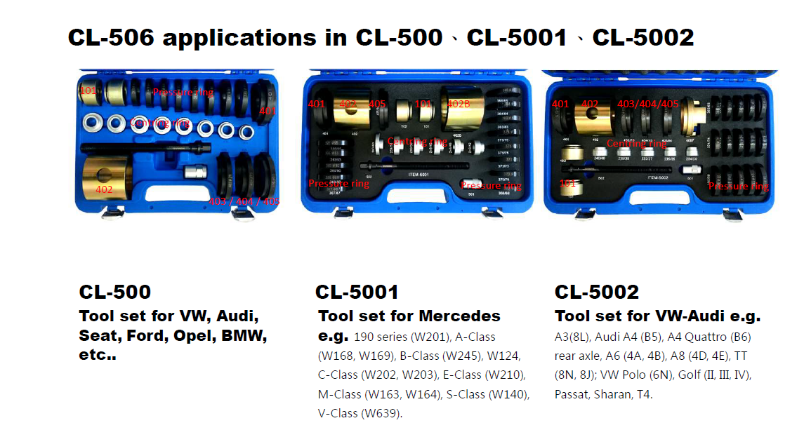 - The kit is designed to press out of the universal joint drive shaft / drive shaft 【pressure piece(506-6) ; adapter(506-5); pressure spindle(506-3);pull spindle(506-2)】.